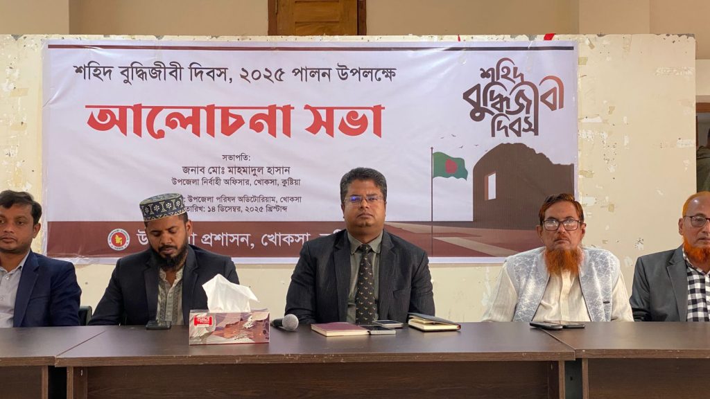আলোচনা সভায় সভাপতিত্ব করেন খোকসা উপজেলা নির্বাহী অফিসার মাহমুদুল হাসান। সভায় বক্তারা ১৯৭১ সালের ১৪ ডিসেম্বর শহীদ বুদ্ধিজীবীদের আত্মত্যাগের ইতিহাস তুলে ধরে বলেন, জাতির শ্রেষ্ঠ সন্তানদের স্মরণ নতুন প্রজন্মের মাঝে মুক্তিযুদ্ধের চেতনা জাগ্রত করতে গুরুত্বপূর্ণ ভূমিকা রাখে।