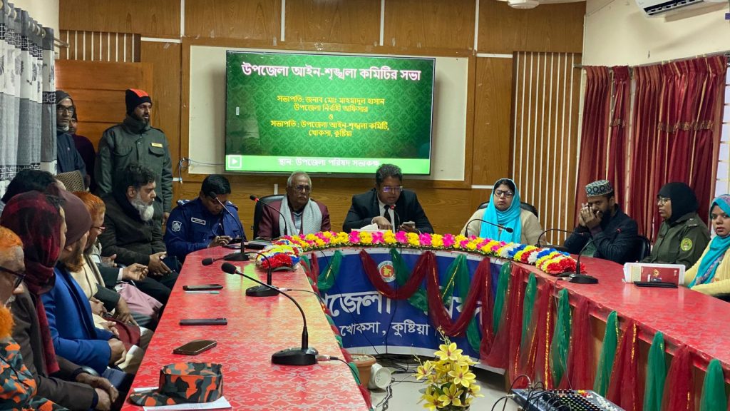 মিলন (খোকসা) কুষ্টিয়া : কুষ্টিয়ার খোকসা উপজেলায় আইন-শৃঙ্খলা পরিস্থিতি স্বাভাবিক রাখা, অপরাধ দমন ও জননিরাপত্তা জোরদার করার লক্ষ্যে উপজেলা আইন শৃঙ্খলা কমিটির সভা অনুষ্ঠিত হয়েছে।