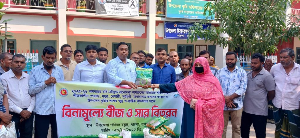 এস.কে. পাল সমীর (পাংশা) রাজবাড়ী : রাজবাড়ীর পাংশায় ২০২৫-২৬ অর্থবছরের রবি মৌসুমে প্রণোদনা কার্যক্রমের আওতায় ক্ষুদ্র ও প্রান্তিক কৃষকদের মাঝে বিনামূল্যে বীজ ও সার বিতরণ কার্যক্রমের উদ্বোধন করা হয়েছে। রবিবার (২৬ অক্টোবর) সকালে পাংশা উপজেলা পরিষদ চত্বরে এই বিতরণ কার্যক্রম অনুষ্ঠিত হয়।