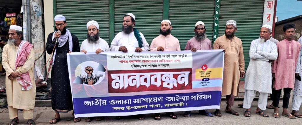 রাজবাড়ী ভয়েস ডট কম: রাজবাড়ী (৮ অক্টোবর) — নর্থ সাউথ ইউনিভার্সিটির (এনএসইউ) শিক্ষার্থী অপূর্ব পাল কর্তৃক কোরআন অবমাননার ঘটনায় অভিযুক্তের বিরুদ্ধে সর্বোচ্চ শাস্তির দাবি জানিয়েছেন জাতীয় ওলামা-মাশায়েখ আইম্মা পরিষদ রাজবাড়ী শাখা। বুধবার বিকেল ৫টায় রাজবাড়ী প্রেসক্লাবের সামনে সদর উপজেলা শাখার আয়োজনে মানববন্ধন অনুষ্ঠিত হয়।
