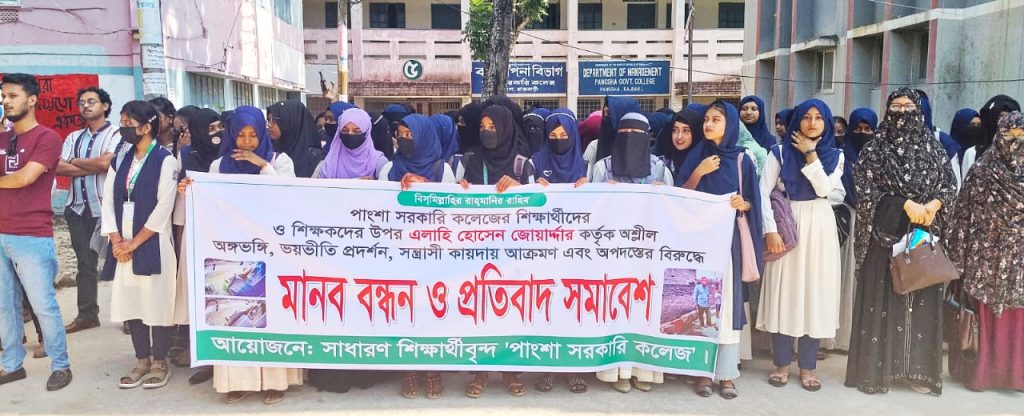 এস, কে পাল সমীর (পাংশা) রাজবাড়ী : রাজবাড়ীর পাংশা সরকারি কলেজের শিক্ষক ও শিক্ষার্থীদের ওপর এলাহি হোসেন জোয়াদ্দার কর্তৃক অশ্লীল অঙ্গভঙ্গি, ভয়ভীতি প্রদর্শন, সন্ত্রাসী কায়দায় আক্রমণ এবং অপদস্ত করার ঘটনার প্রতিবাদে মানববন্ধন ও প্রতিবাদ সমাবেশ অনুষ্ঠিত হয়েছে।